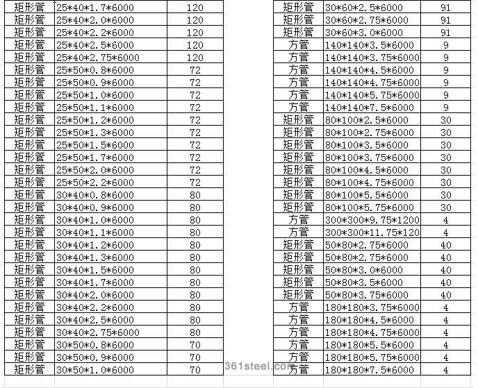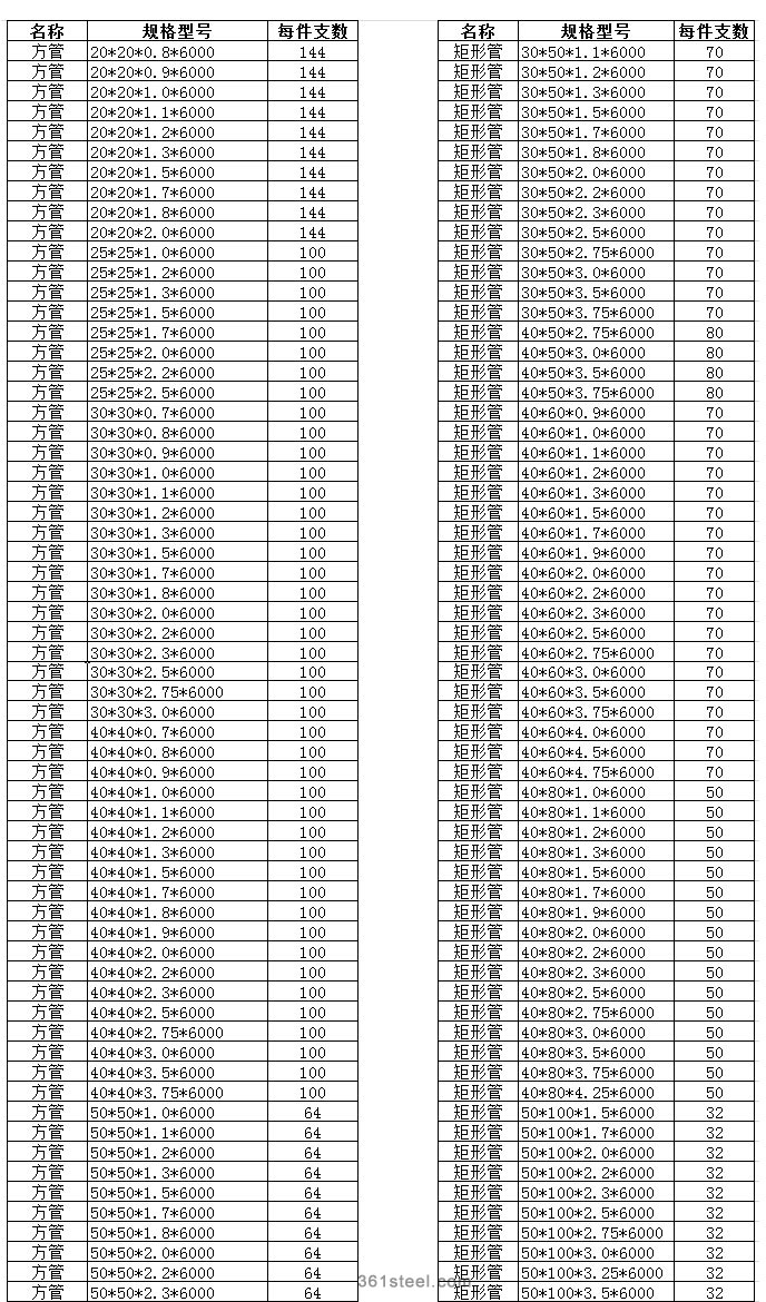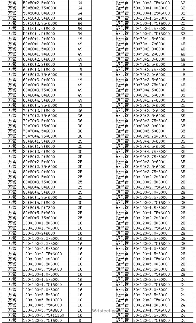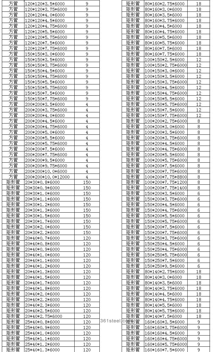 以上規(guī)格為天津生產(chǎn)的方管,材質(zhì)為Q195-235。要下載EXL文檔的請點擊這里(下載)。