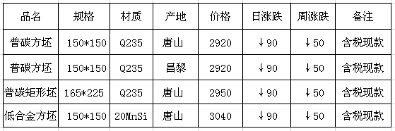 今日晚盤,唐山部分普碳鋼坯報(bào)價(jià)追跌10元/噸,累計(jì)下跌90元/噸,現(xiàn)含稅出廠價(jià)2920元/噸,矩形方坯現(xiàn)金含稅價(jià)為2950元/噸,低合金方坯20Mnsi現(xiàn)金含稅價(jià)3040元/噸。
