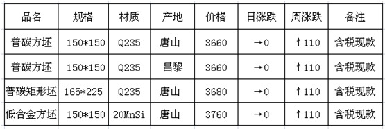 市場(chǎng)報(bào)價(jià):今日無(wú)錫地區(qū)普碳坯價(jià)格平穩(wěn)報(bào)3700元/噸;山東淄博普碳坯價(jià)格上漲50元/噸報(bào)3720元/噸;福州地區(qū)普碳坯價(jià)格平穩(wěn)報(bào)3660元/噸;武漢地區(qū)普碳坯價(jià)格平穩(wěn)報(bào)3770元/噸;遼寧北臺(tái)普碳坯價(jià)格平穩(wěn)報(bào)3690元/噸;山西介休普碳坯價(jià)格上漲50元/噸報(bào)3620元/噸;河南安陽(yáng)普碳坯價(jià)格平穩(wěn)報(bào)3750元/噸;廣州地區(qū)普碳坯價(jià)格平穩(wěn)報(bào)3690元/噸。