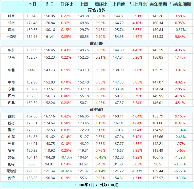 4月16日,國內(nèi)鋼材指數(shù)綜合指數(shù)報150.46點(diǎn)(絕對價格指數(shù)4234.8),較上一交易日上漲0.72%。其中,螺紋鋼指數(shù)報167.86點(diǎn)(絕對價格指數(shù)4243),較上一交易日上漲0.42%;熱卷指數(shù)報144.01點(diǎn)(絕對價格指數(shù)4037.8),較上一交易日上漲0.18%。