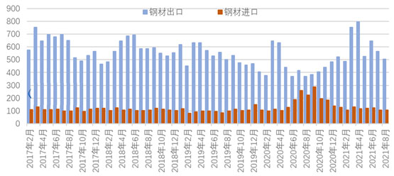 圖1 2017-2021年月度鋼材進(jìn)出口走勢