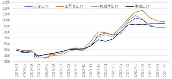 隨著需求觸頂,海外部分地區(qū)鋼材市場價(jià)格持續(xù)回落,我國出口報(bào)價(jià)相對穩(wěn)定,蘭格鋼鐵云商平臺監(jiān)測數(shù)據(jù)顯示,9月6日,中國熱軋卷板出口報(bào)價(jià)(FOB)為941美元/噸,與7月底基本持平,較印度和獨(dú)聯(lián)體出口報(bào)價(jià)分別高76和66美元/噸,較土耳其低34美元/噸(詳見圖2)。