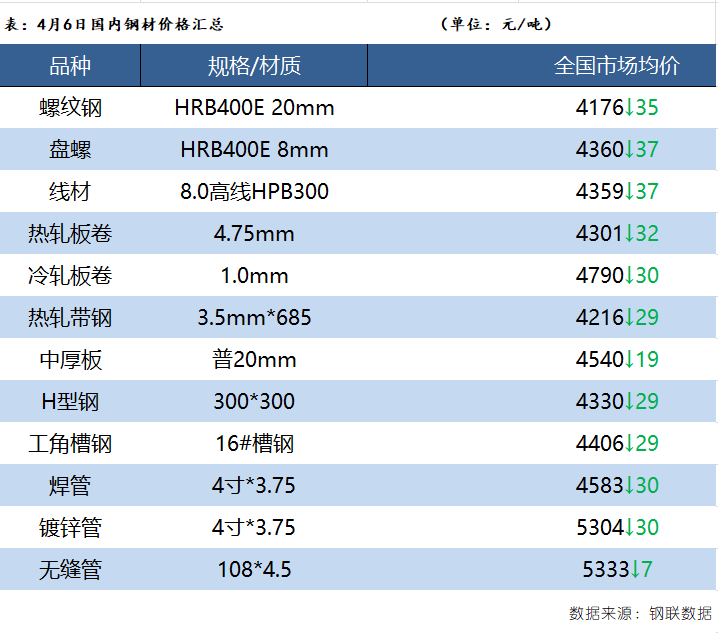 近期建材市場信心受挫,悲觀情緒仍存,觀望情緒較強(qiáng),補(bǔ)貨操作并不積極。市場仍處于供大于求的狀態(tài),價格反彈乏力,市場需求釋放不及預(yù)期,降庫速度較緩,市場悲觀情緒及期盤利空影響下,預(yù)計近期國內(nèi)帶鋼市場價格或窄幅盤整。 今日國內(nèi)無錫方管等型材市場活躍度低,商戶觀望心態(tài)明顯,尾盤成本端鋼坯出廠價格持穩(wěn),成本端支撐,鋼市下降運(yùn)行。截至4月9日,國內(nèi)建材市場價格小幅下降、冷軋價格普遍下調(diào)、中厚板價格走低、熱卷市場價格跌幅加劇、無縫管市場窄幅下行、型材市場價格下跌、帶鋼價格下調(diào)為主、涂鍍價格全面下跌,優(yōu)特鋼價格穩(wěn)中有跌、焊管方管鍍鋅管弱勢運(yùn)行。