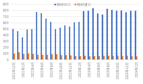 據(jù)相關(guān)統(tǒng)計(jì)數(shù)據(jù)顯示,2024年1-2月,我國進(jìn)口鋼材113.1萬噸,同比下降8.1%,2024年1-2月,我國出口鋼材1591.2萬噸,同比增長32.6%;。