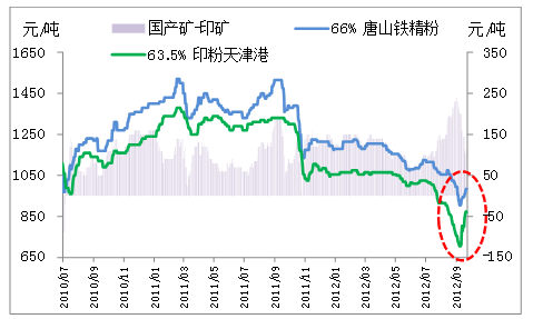 進口礦與國產礦同樣表現(xiàn)迥異。今年7月以來,進口礦呈現(xiàn)加速下跌態(tài)勢,一度跌至9月初的88美元/噸,跌幅達24.1%。受QE3和國內利好消息影響,在短短一周內又迅速反彈14.2%,達到112.5美元/噸。而國產礦的跌幅相對較小,本輪下跌跌幅為19.5%,9月9日開始的反彈幅度為9.17%,明顯小于進口礦(如圖4所示)。究其原因,主要是由于今年自進口礦出現(xiàn)暴跌以來,內外礦價差由最大時的250元/噸左右縮小到目前的105元/噸左右,進口礦的價格優(yōu)勢愈發(fā)明顯,很多國內企業(yè)更傾向于使用進口礦,導致外礦配比高企,甚至一度達到了93%的歷史高位。另一方面,國內礦山由于生產成本較高,很快跌破邊際成本,大幅的虧損導致國內部分礦山陷入停產,內礦價格也逐漸趨于穩(wěn)定。