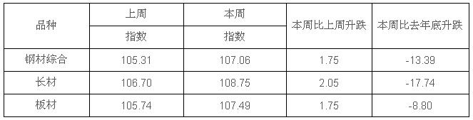 中國國內(nèi)鋼市最新鋼材綜合價格指數(shù)和板材、長材價格指數(shù)(含稅)統(tǒng)計表如下:
