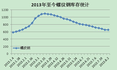 螺紋鋼庫存方面:截止到8月2日,全國主要城市螺紋鋼庫存為650.04萬噸,與上周(2013-7-26)相比,本周全國螺紋鋼庫存下降4.79萬噸,降幅為0.73%,降幅較上周有所收窄;與去年同期(2012-8-3)相比,下降50.83萬噸,同比降幅為7.25%,降幅有所擴大。