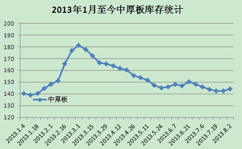中厚板庫存方面:截止到8月2日,中厚板庫存為21.71萬噸,較上周(2013年7月26日)增加0.24萬噸。